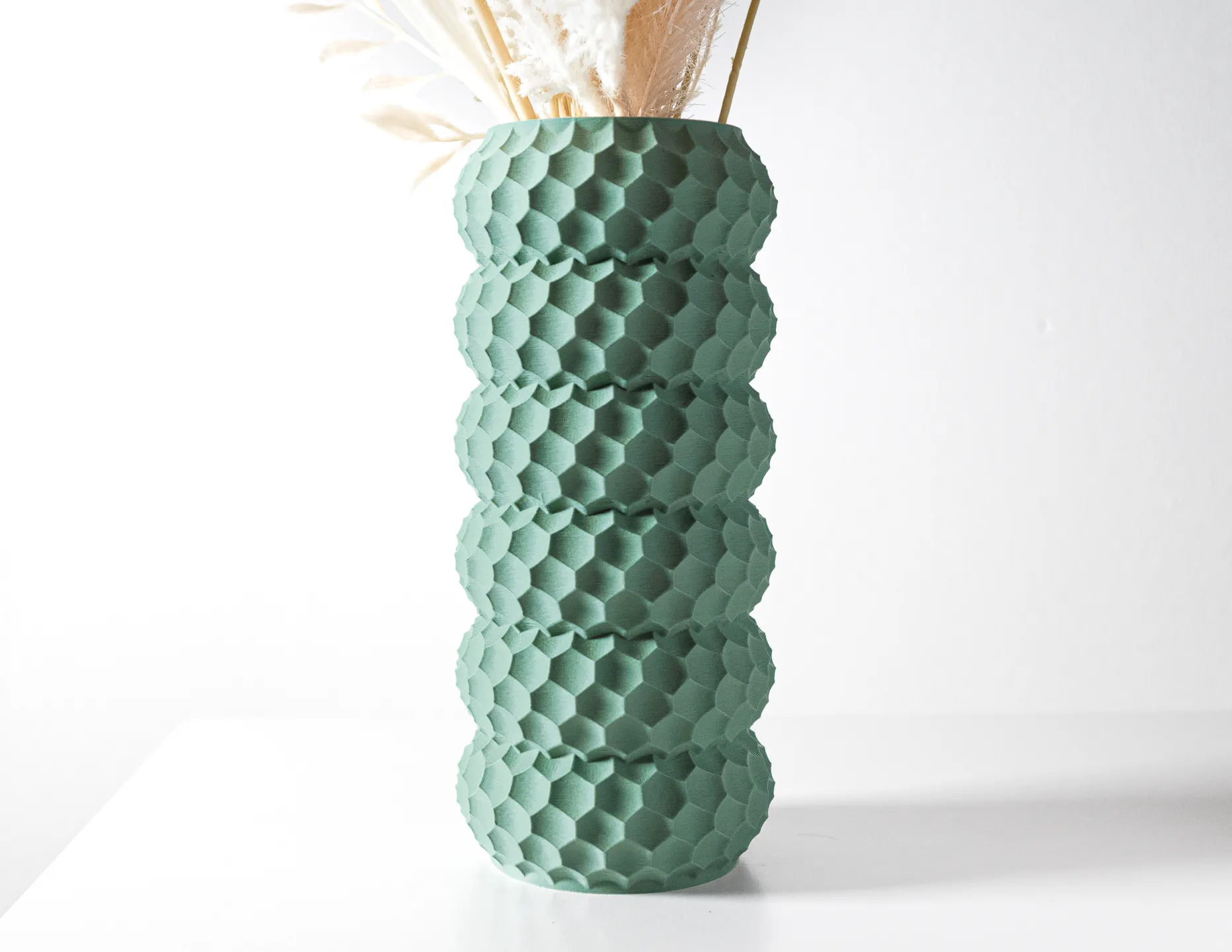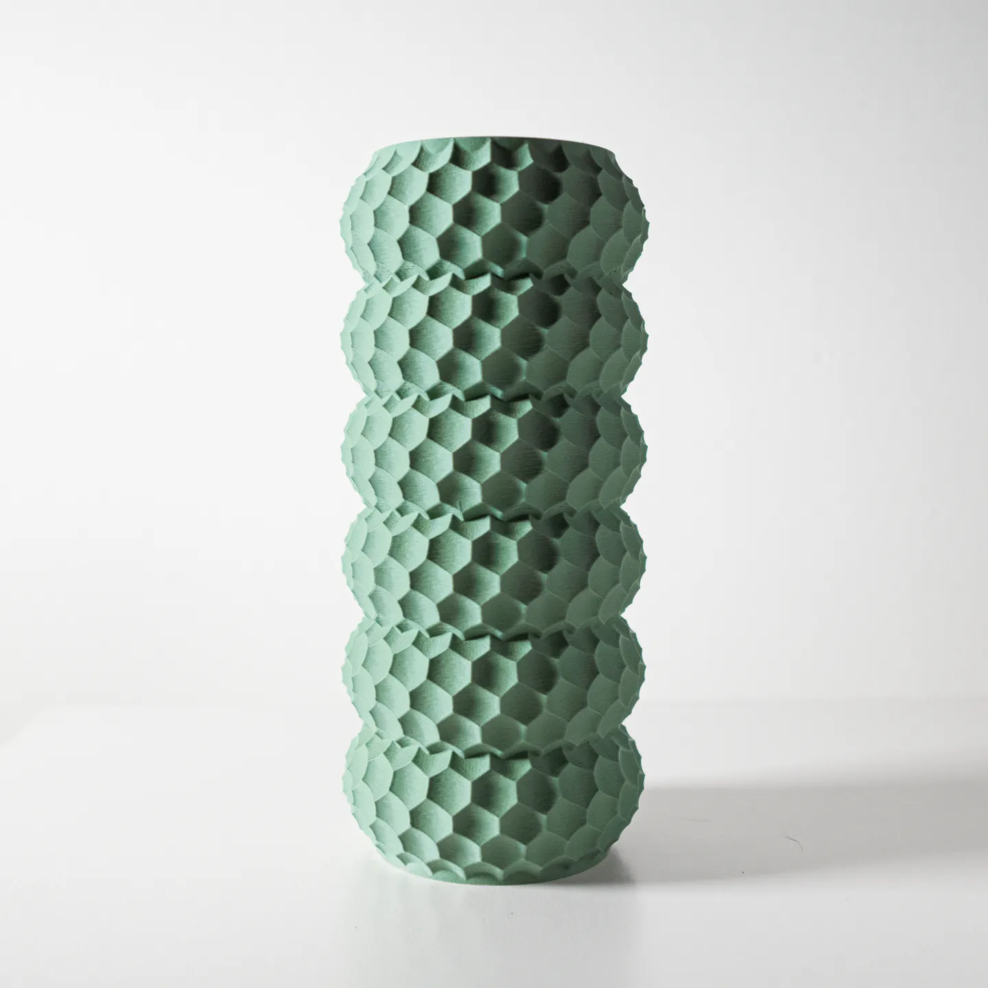 El Florero Célula destaca por su impactante textura hexagonal que recuerda a la estructura de una colmena o una célula orgánica, generando un efecto visual táctil y moderno. Su forma cilíndrica segmentada en módulos repetitivos otorga dinamismo y profundidad, mientras que su tono verde jade aporta frescura y serenidad al ambiente. Fabricado mediante impresión 3D con materiales sostenibles, es perfecto para flores secas, pampas o como pieza decorativa autónoma. Encaja armónicamente en espacios minimalistas, escandinavos o de inspiración natural.