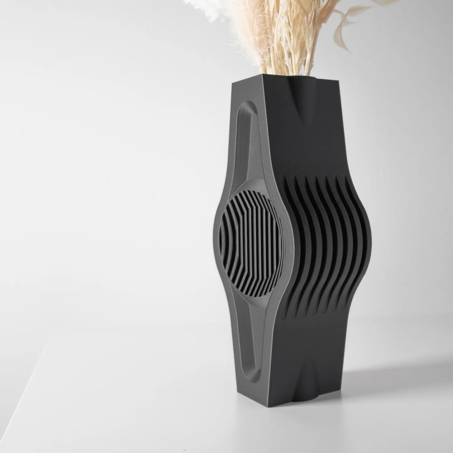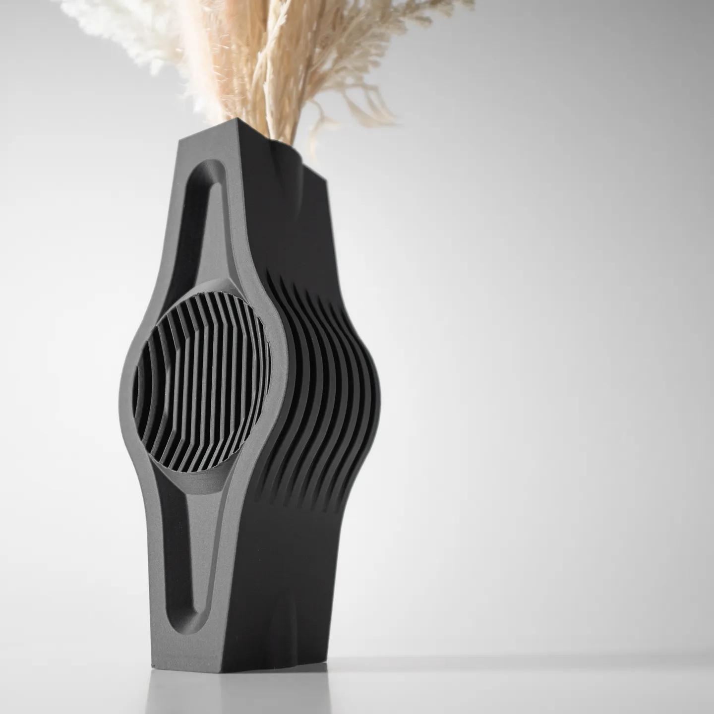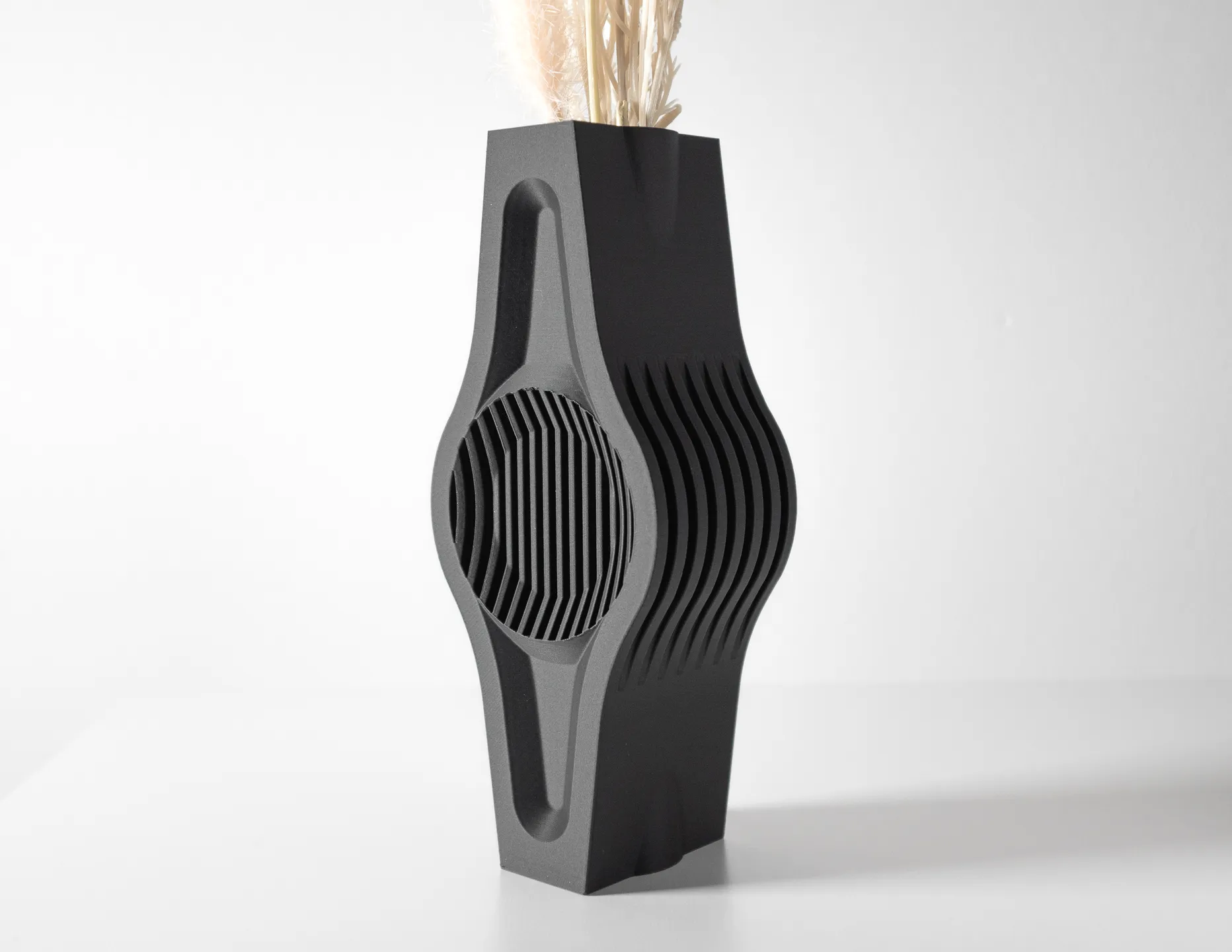 El Florero Miro destaca por su audaz diseño escultórico, compuesto por formas onduladas y cortes verticales que generan un juego de luces y sombras hipnótico. Su estructura simétrica y futurista, unida al acabado en negro grafito mate, lo convierten en una pieza de alto impacto visual. Fabricado mediante impresión 3D con materiales sostenibles, es ideal para flores secas o pampas, y perfecto para ambientes industriales, contemporáneos o artísticos.