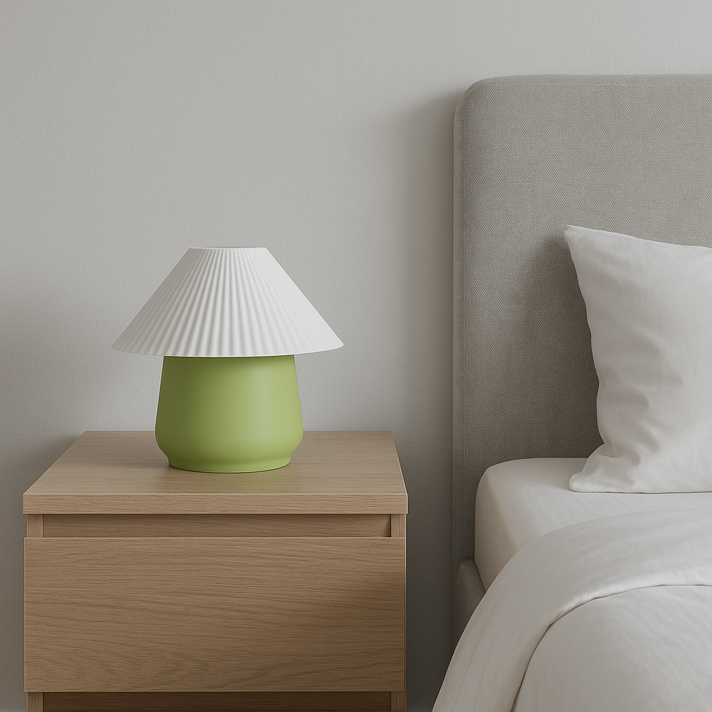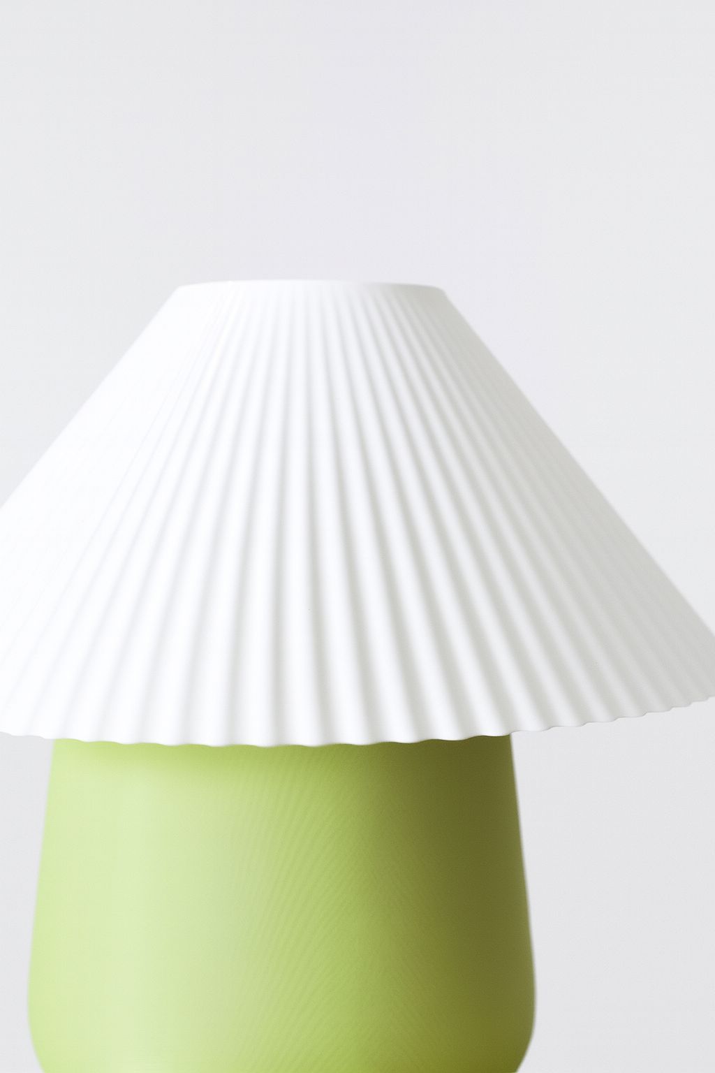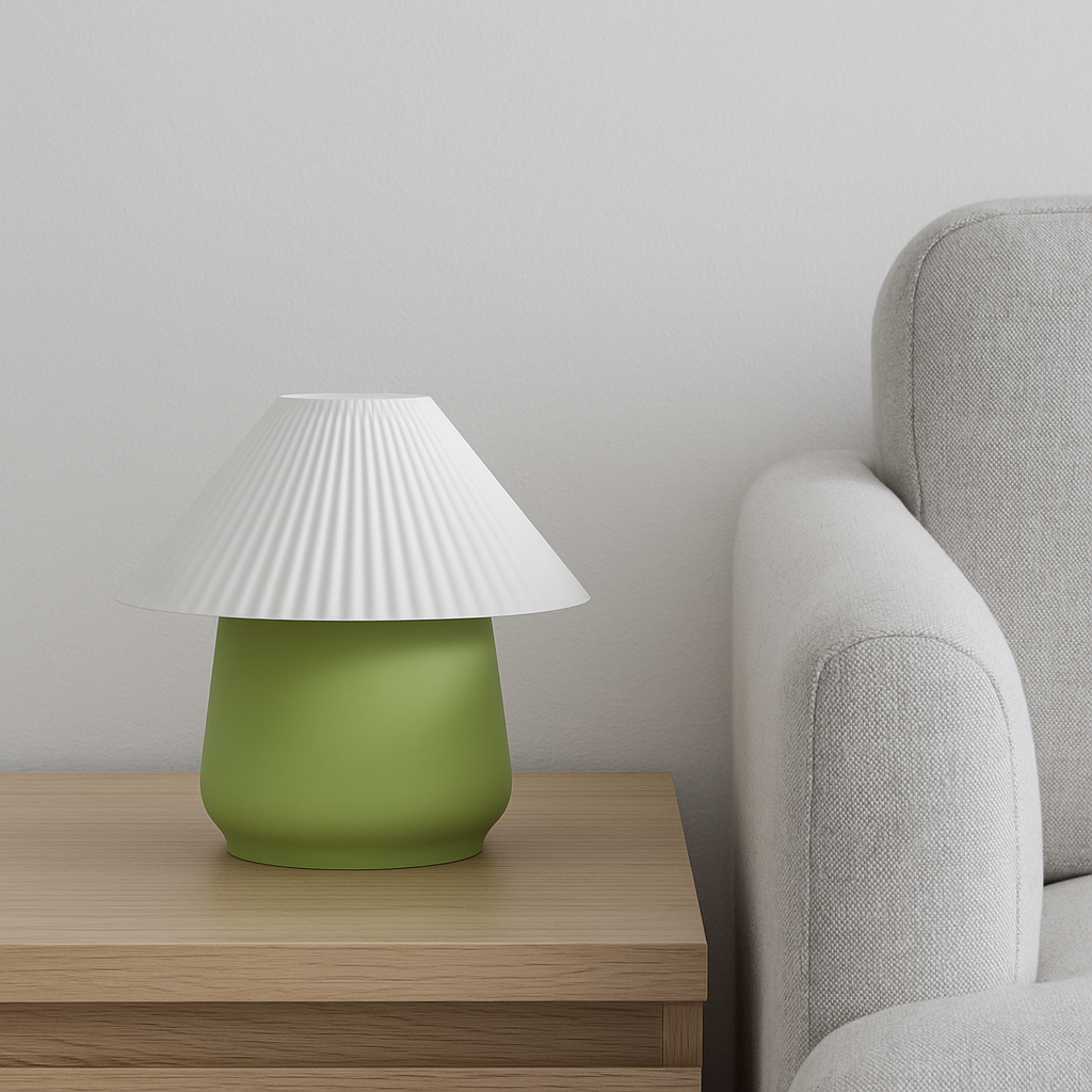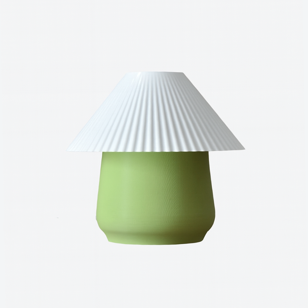 La Lámpara Fungus destaca por su silueta minimalista y armoniosa, con una pantalla plisada en blanco que se abre como un abanico sobre una base verde suave, evocando frescura y equilibrio. Fabricada mediante impresión 3D con materiales sostenibles, combina estética y responsabilidad ambiental en una pieza compacta y funcional. Su diseño versátil se adapta a espacios modernos, nórdicos o creativos, aportando un toque de color y personalidad. Perfecta para generar una iluminación suave y acogedora, transforma cualquier rincón en un ambiente relajante.