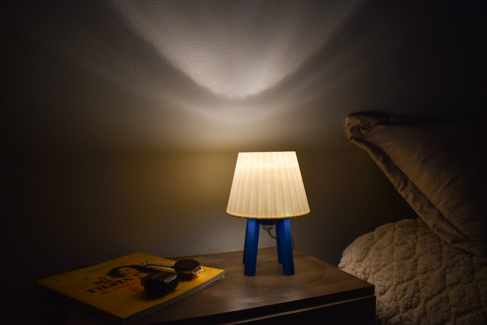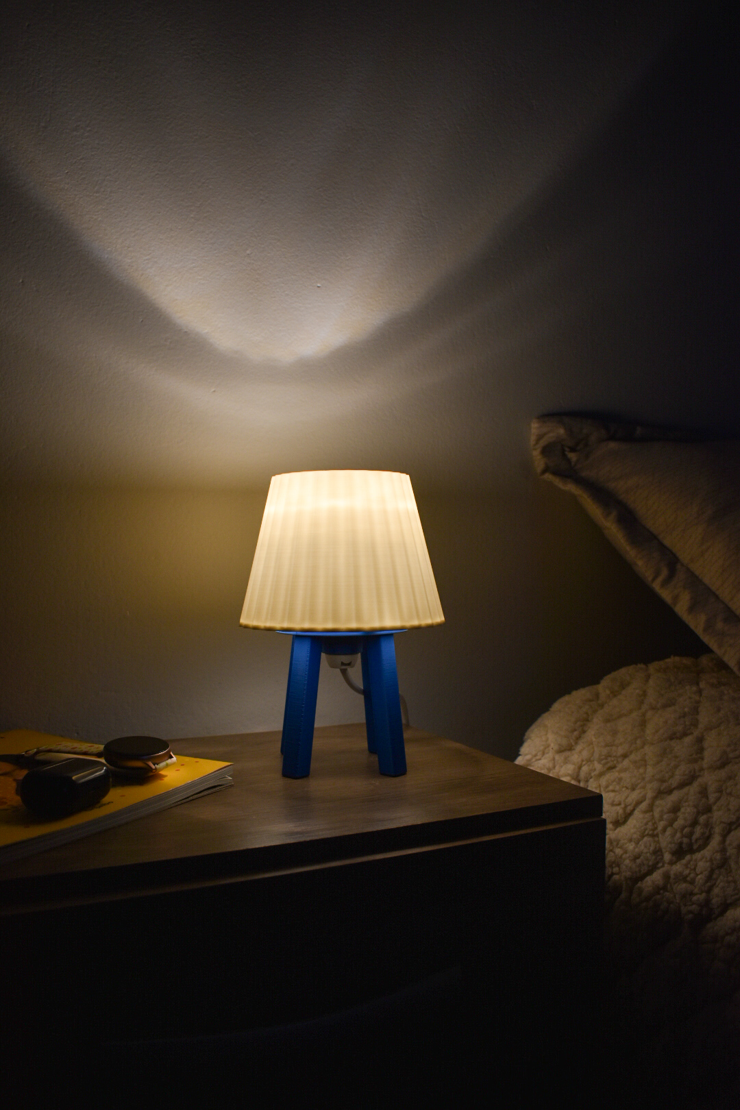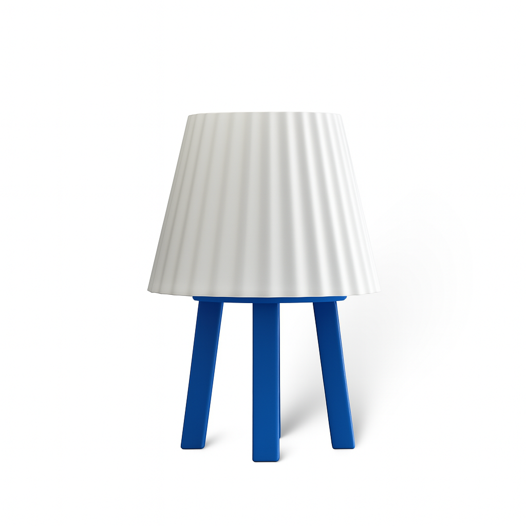 La Lámpara Medusa destaca por su diseño escandinavo y minimalista que combina una pantalla plisada de acabado mate con una base de patas en azul cobalto vibrante. Su forma simétrica y líneas limpias aportan carácter sin sobrecargar el ambiente, perfecta para espacios creativos, estudios o mesas de noche. Fabricada en impresión 3D con materiales sostenibles, esta pieza no solo ilumina, sino que también decora con personalidad.