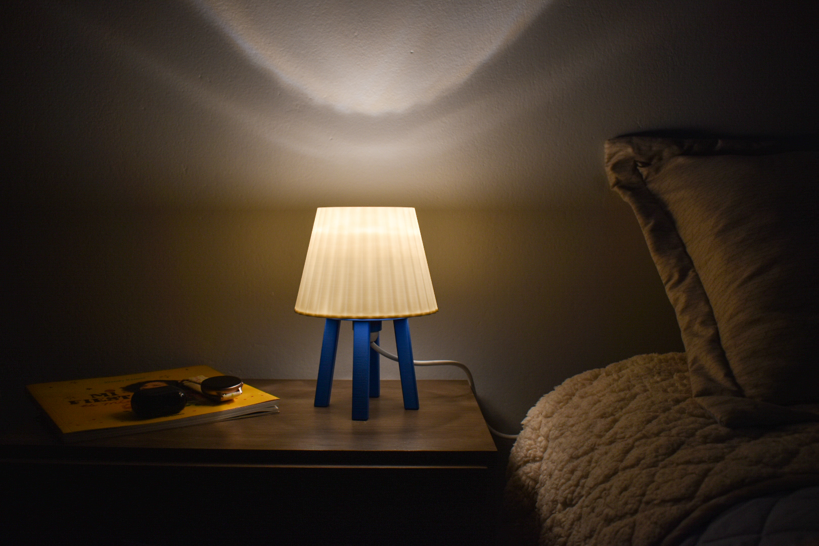 Lámpara de diseño con pantalla plisada blanca y patas azules. Moderna, compacta y llena de estilo.