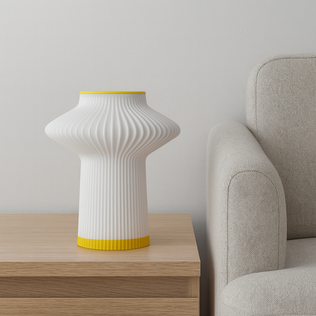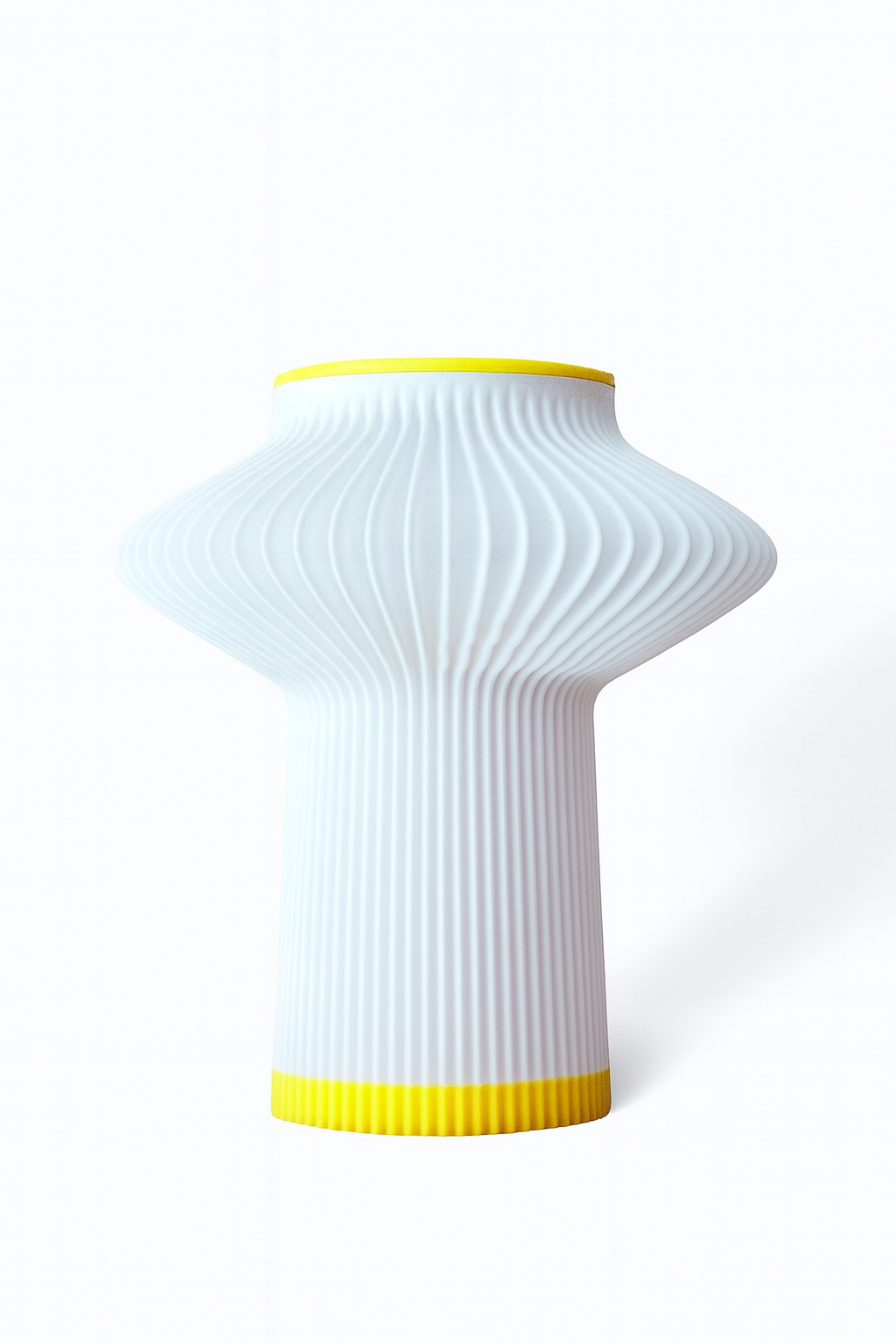 La Lámpara Yara deslumbra con su silueta moderna y fluida, formada por delicadas líneas verticales que se curvan suavemente creando un efecto visual dinámico y elegante. Su cuerpo blanco con acentos amarillos en la base y la parte superior aporta un toque vibrante y contemporáneo, ideal para dar vida a cualquier espacio. Fabricada mediante impresión 3D con materiales sostenibles, combina diseño innovador y compromiso ambiental. Perfecta para brindar una luz suave y decorativa, transforma ambientes modernos, creativos o minimalistas en rincones acogedores y llenos de estilo.