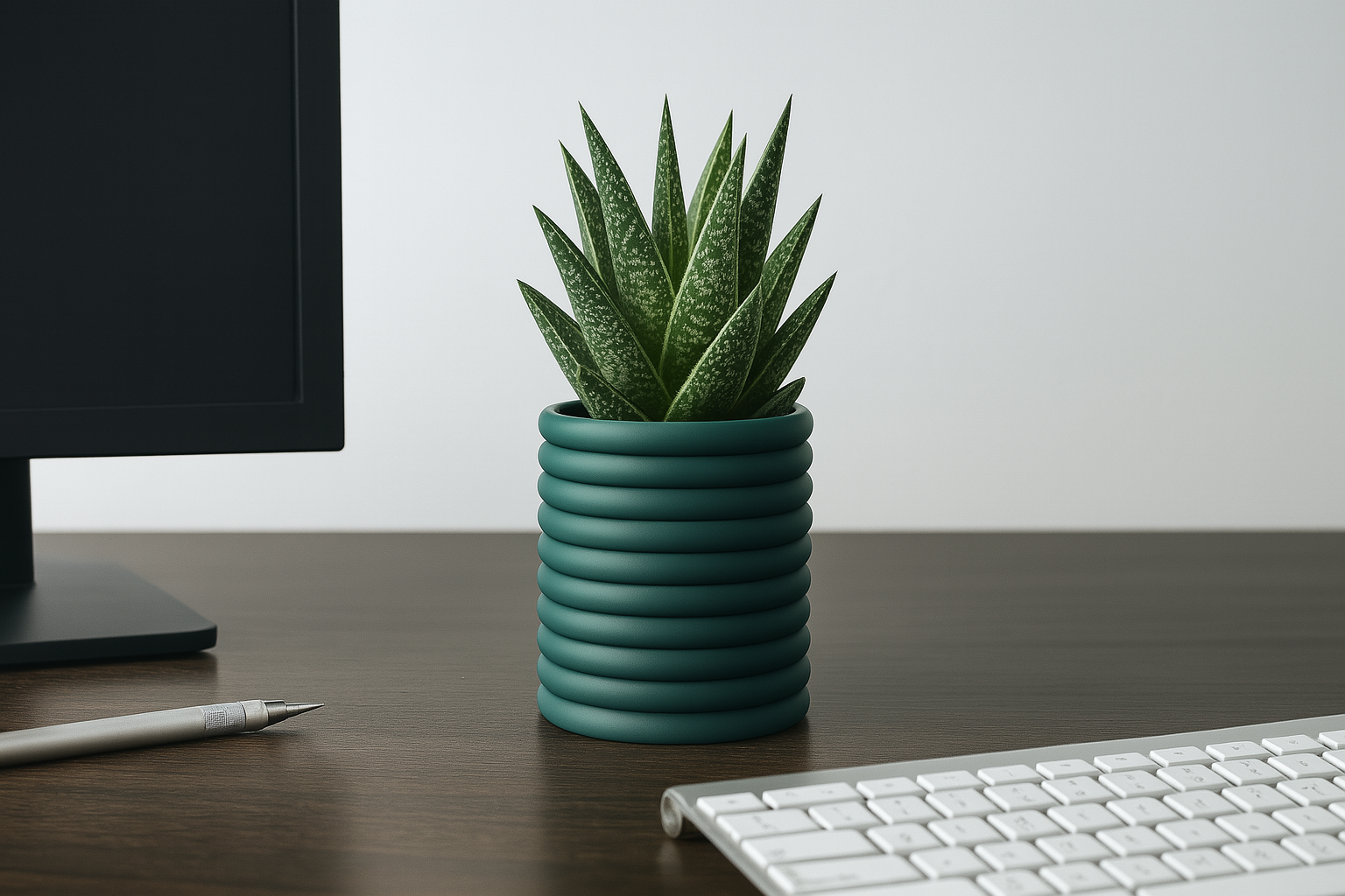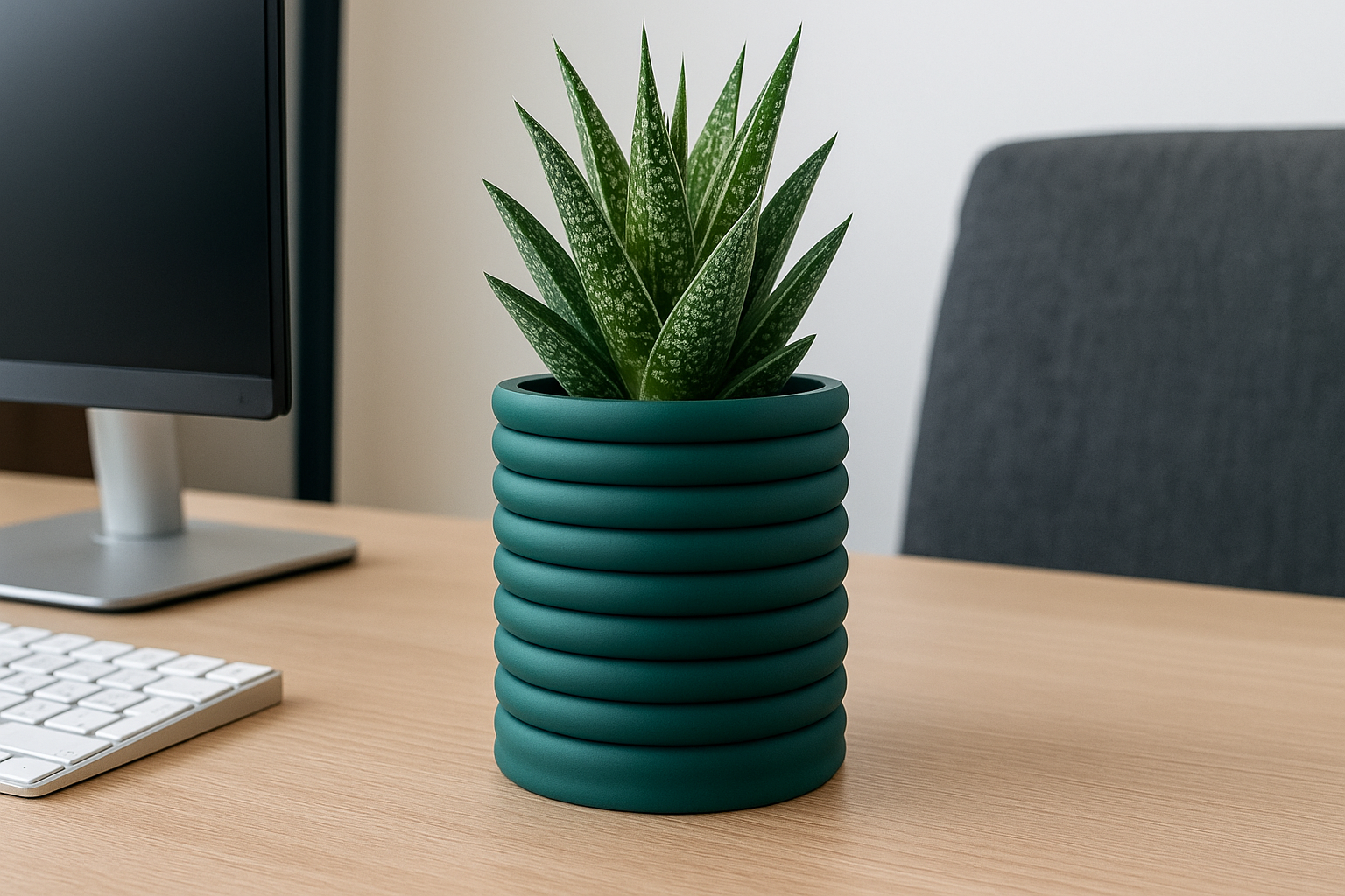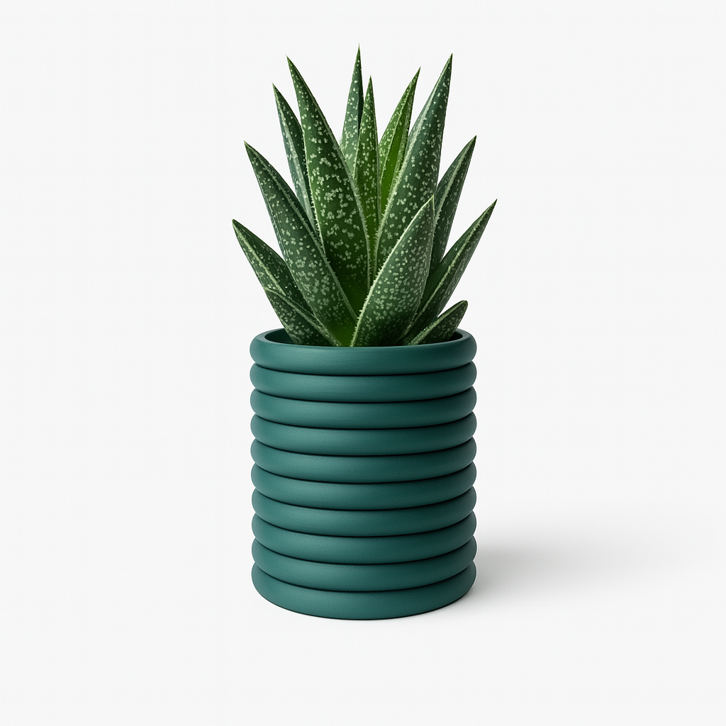 La Maceta Anillo destaca por su diseño cilíndrico con anillos concéntricos que evocan armonía y equilibrio. Su acabado mate en color verde jade aporta frescura y modernidad a cualquier espacio. Además, cuenta con un sistema de drenaje integrado en la parte inferior, lo que permite mantener las raíces de tus plantas saludables al evitar el exceso de agua. Impresa en 3D con materiales sostenibles, esta pieza combina estilo y funcionalidad a la perfección.