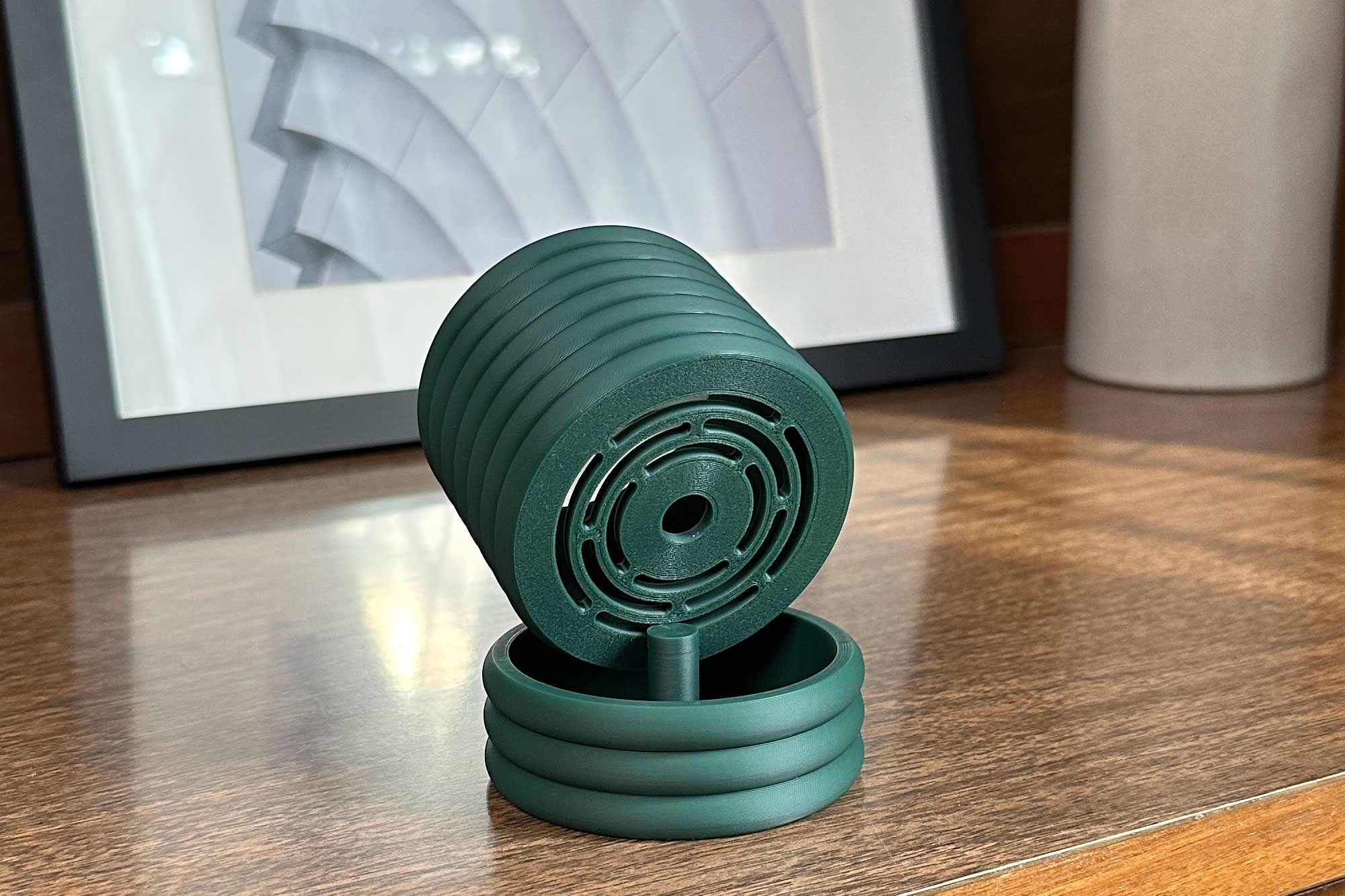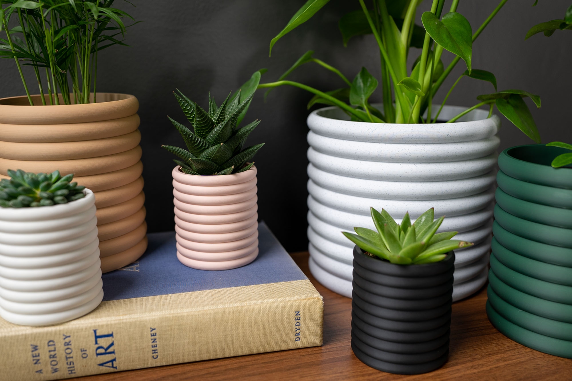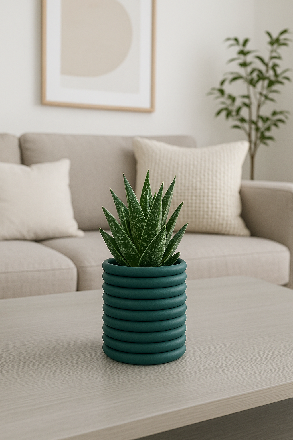 La Maceta Anillo destaca por su diseño cilíndrico con anillos concéntricos que evocan armonía y equilibrio. Su acabado mate en color verde jade aporta frescura y modernidad a cualquier espacio. Además, cuenta con un sistema de drenaje integrado en la parte inferior, lo que permite mantener las raíces de tus plantas saludables al evitar el exceso de agua. Impresa en 3D con materiales sostenibles, esta pieza combina estilo y funcionalidad a la perfección.