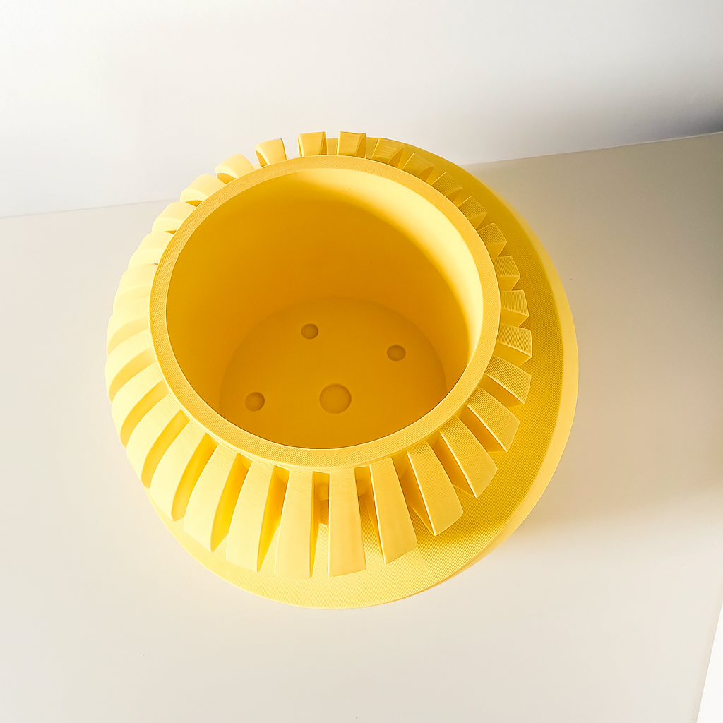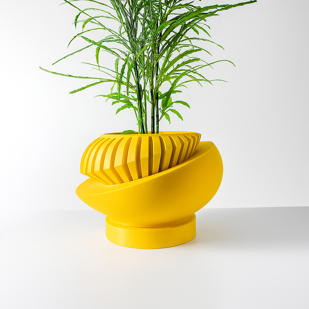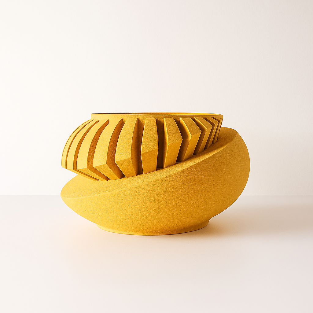 La Maceta Orbita combina dinamismo y elegancia en una estructura que parece estar en movimiento. Impresa en 3D, su diseño en espiral con relieves facetados evoca el giro de un satélite o una pieza escultórica futurista. Ideal para interiores modernos, artísticos o minimalistas que buscan una pieza decorativa de alto impacto.