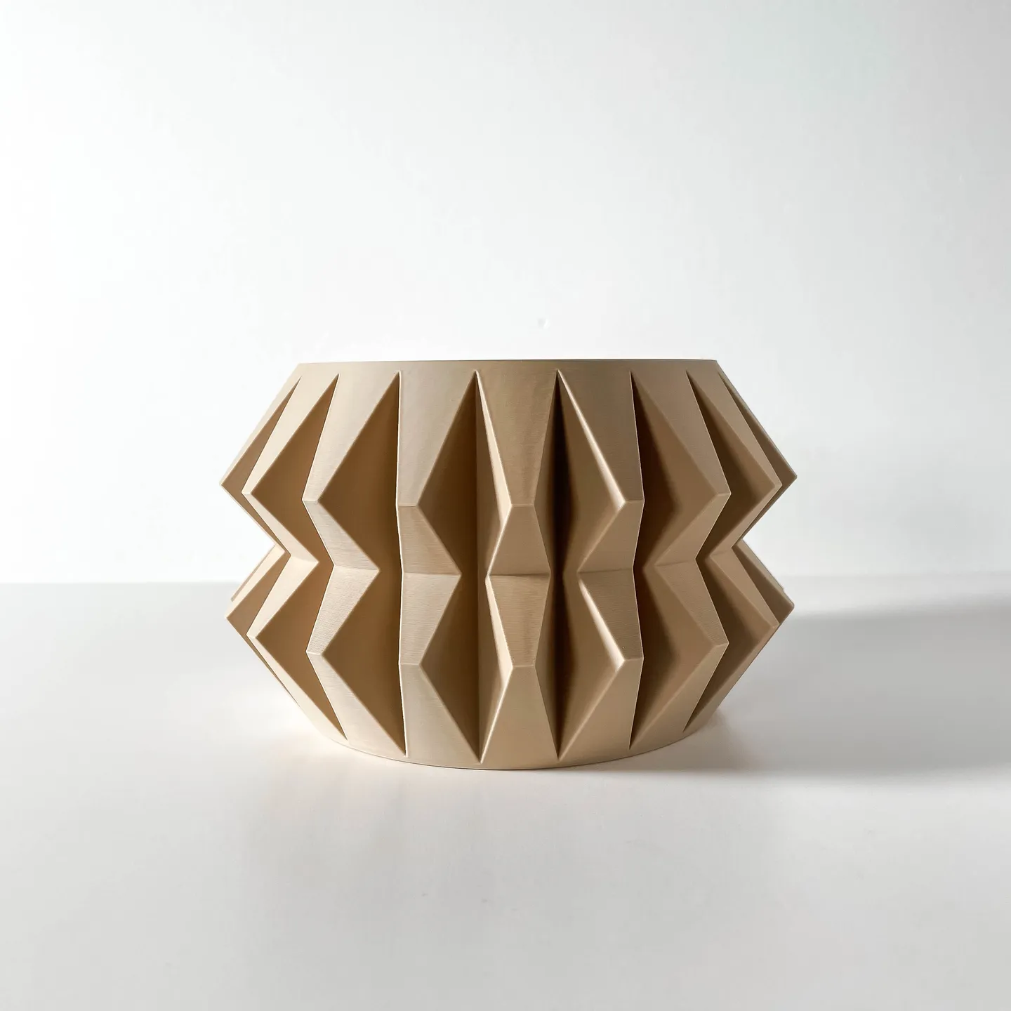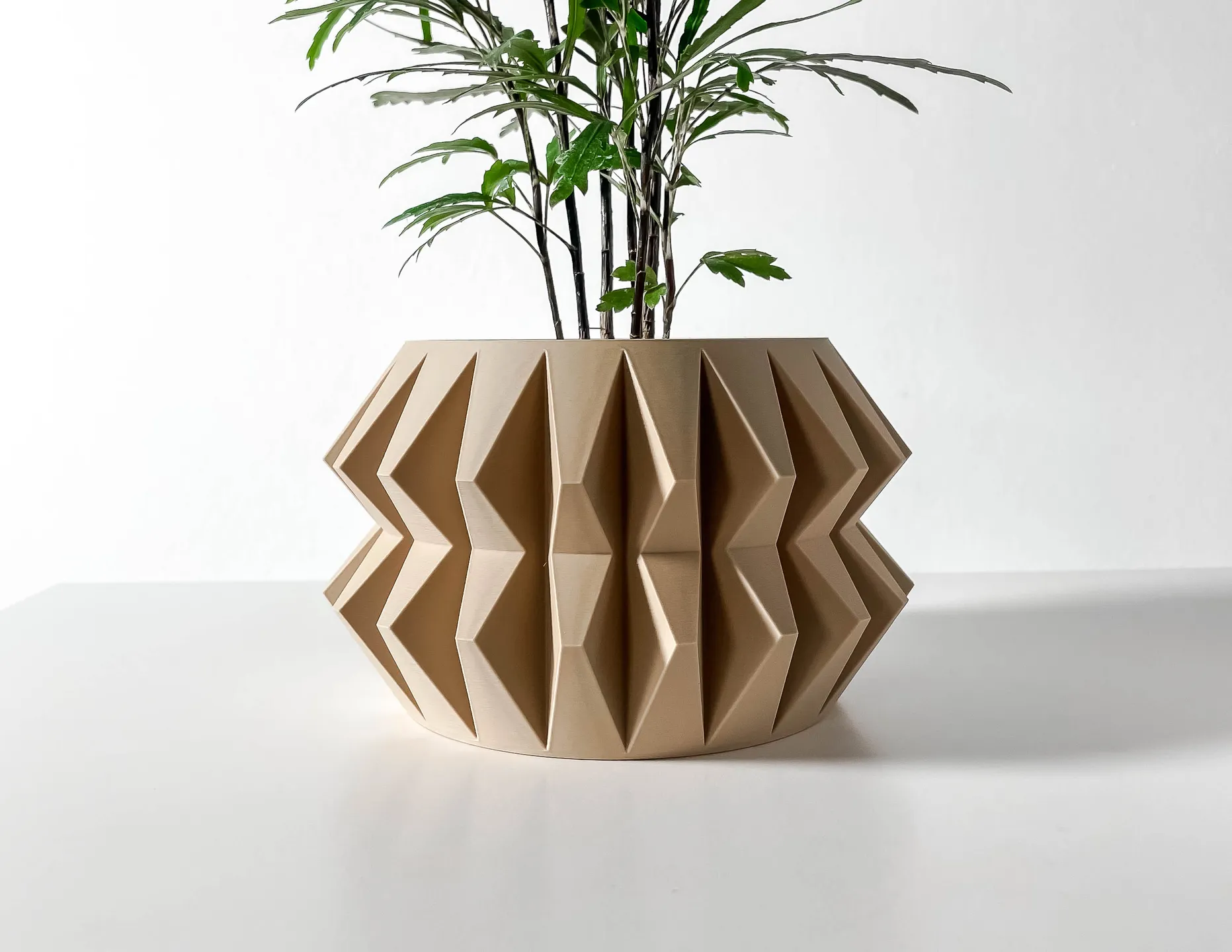 Inspirada en los pliegues del origami y las formas escultóricas, la Maceta Origami Duna combina arte, diseño y funcionalidad. Su silueta en zigzag tridimensional, impresa en 3D con acabado mate en tono arena, convierte cualquier planta en el centro de atención. Perfecta para interiores modernos, minimalistas o boho.