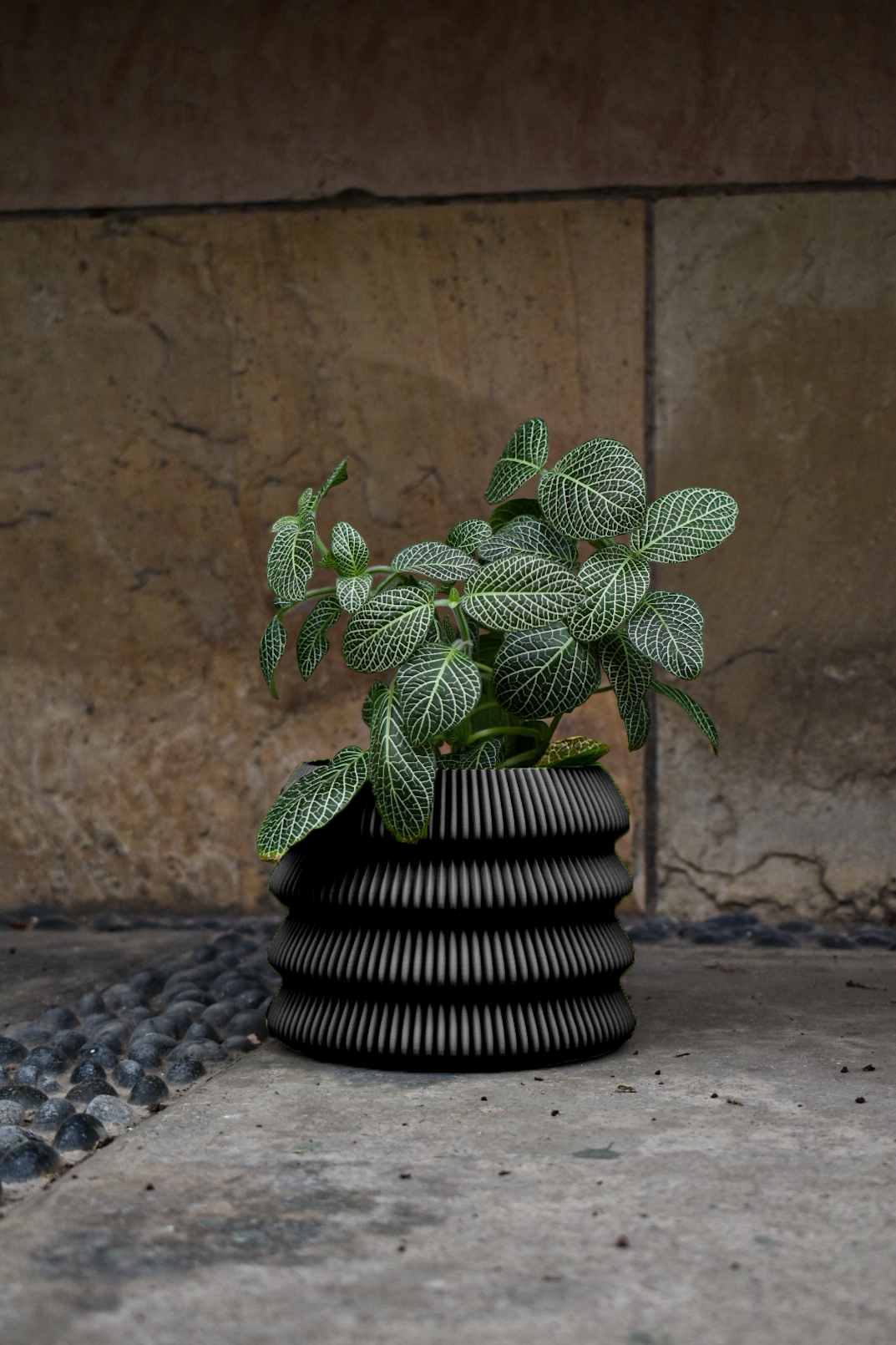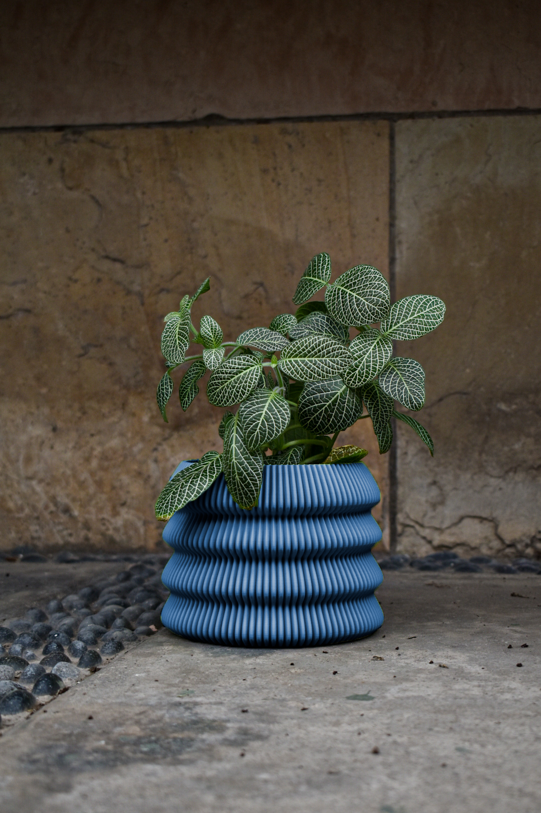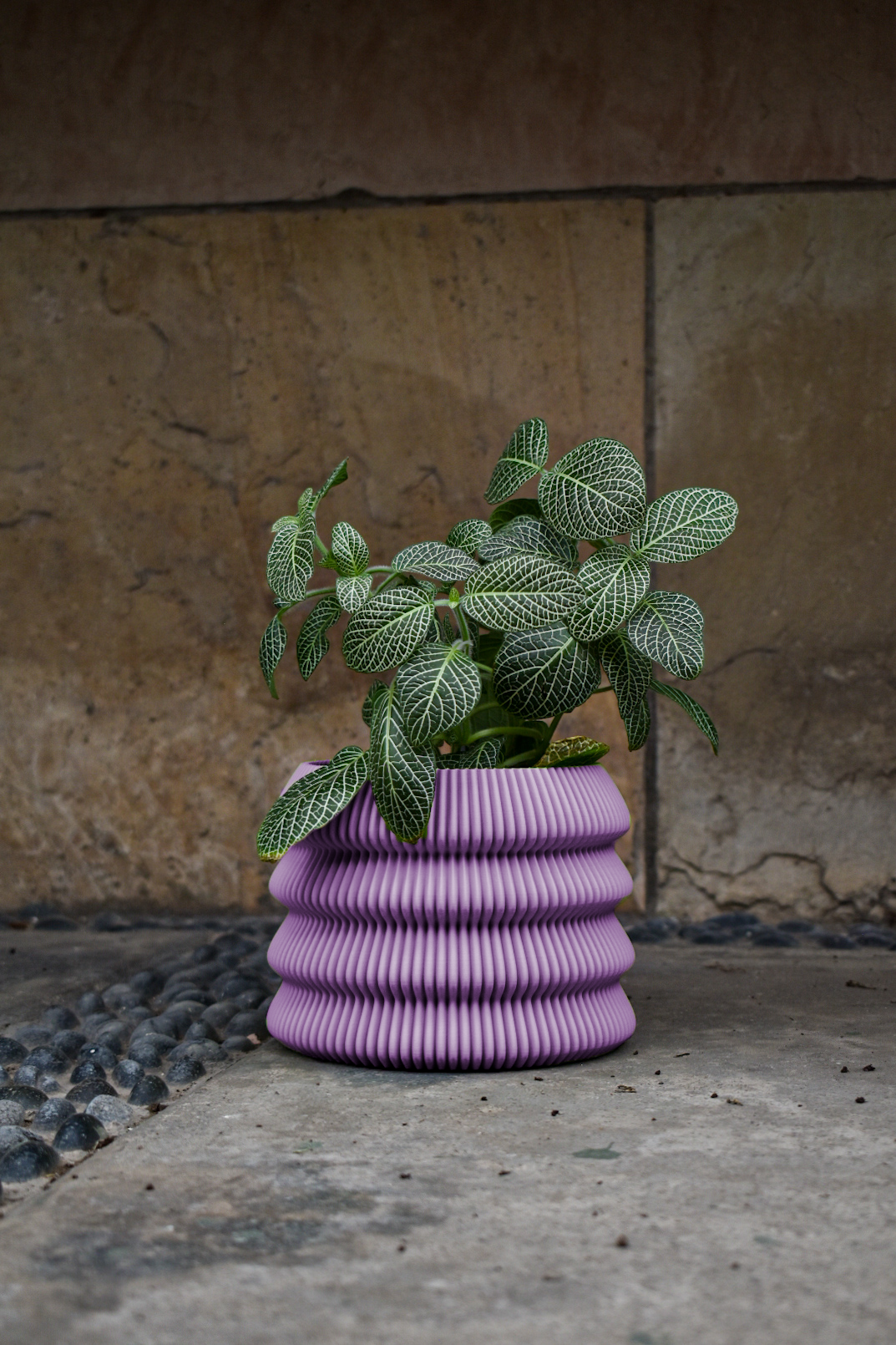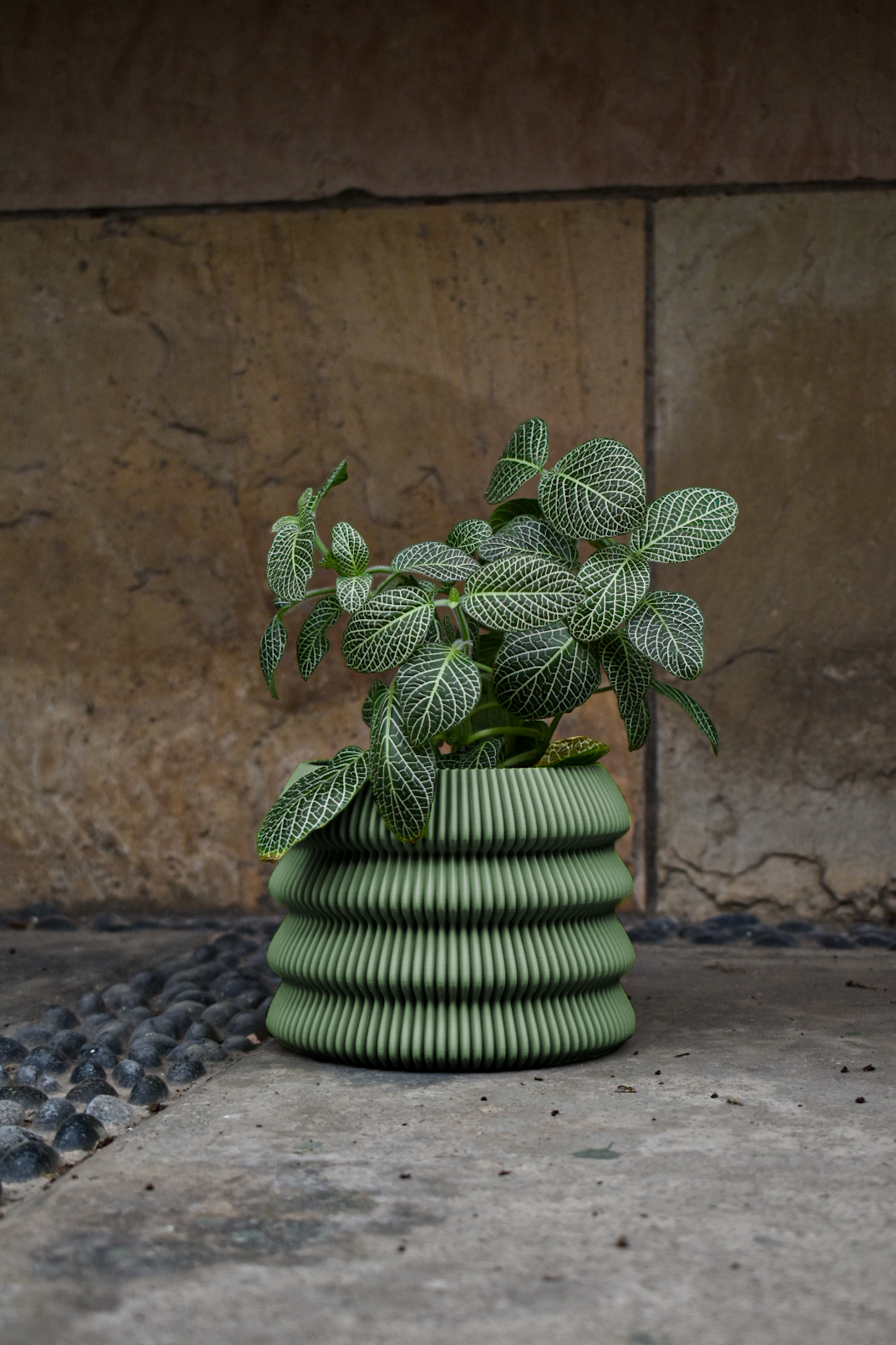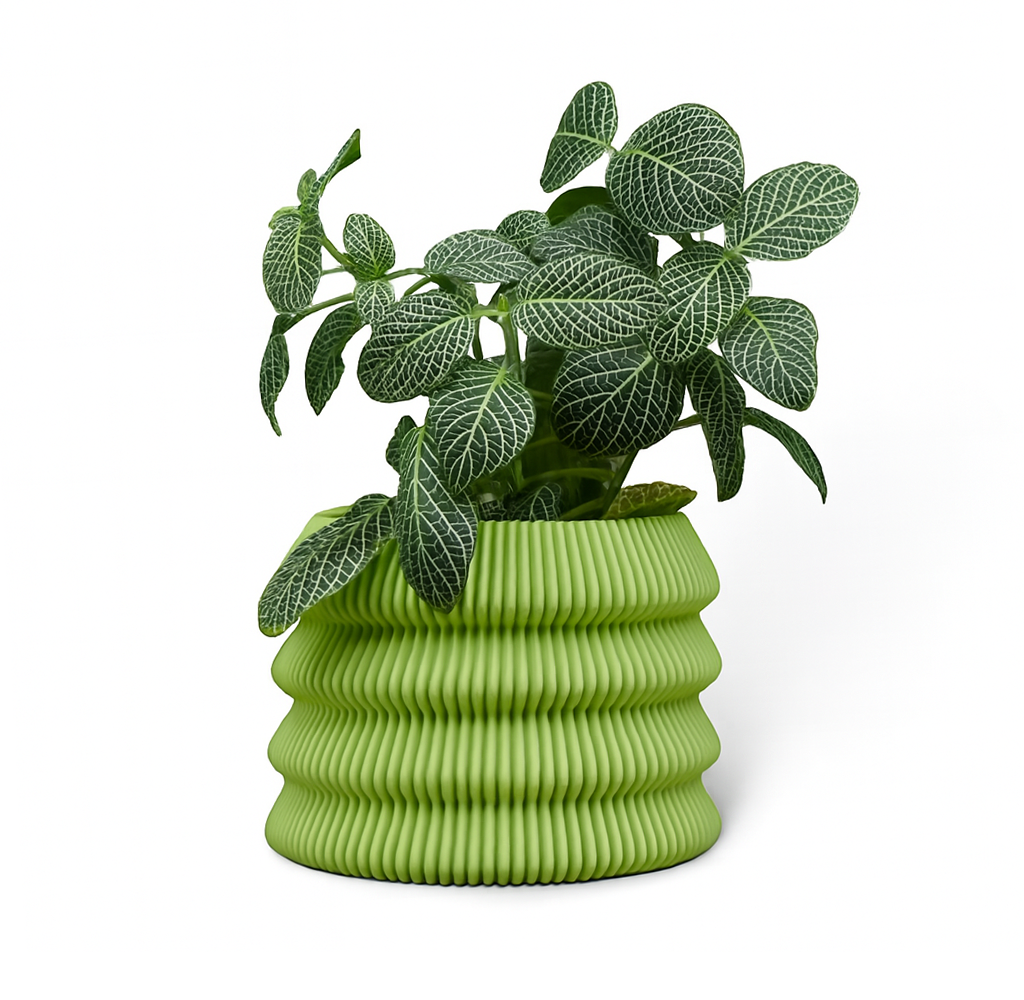 El Porta Maceta Melissa cautiva con su diseño plisado tipo fuelle, que combina estética contemporánea y dinamismo visual. Su forma acanalada no solo aporta textura y movimiento, sino que también transmite una sensación de fluidez natural. El acabado en tono verde lima mate añade un aire fresco y moderno, ideal para espacios llenos de vida. Fabricado mediante impresión 3D con materiales sostenibles, permite colocar directamente macetas interiores estándar sin necesidad de trasplantar, siendo una opción práctica, decorativa y ecoamigable.